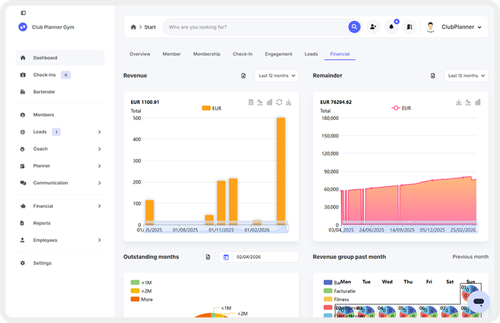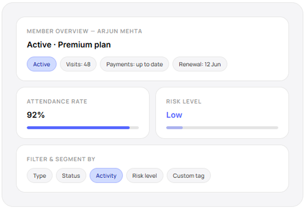 Complete history per member — visits, payments, classes, contracts, and notes — all in one clear overview. Filter members by type, status, activity, risk level, or custom tag. Run targeted campaigns through smart segmentation.