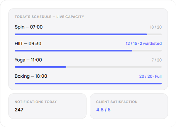 Set maximum capacity per class. When a class fills, a waitlist activates automatically — and members are notified when a spot opens.